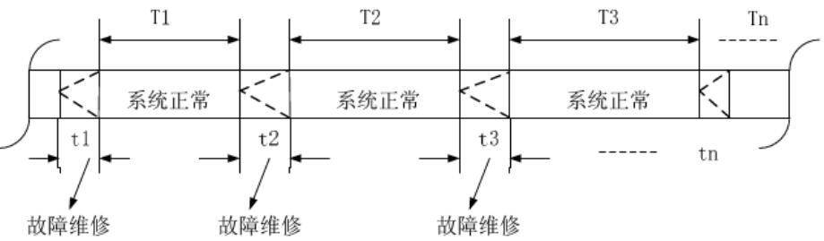 (1)可靠性,指某一時間段內(nèi)設備或系統(tǒng)連續(xù)運行而無故障發(fā)生的概率。重要表征參數(shù)是平均無故障時間(Mean Time Between Failure,簡稱MTBF)是指相鄰兩次故障之間的平均工作時間,也稱平均故障間隔時間。如圖1所示MTBF= ,系統(tǒng)故障率λ= 1/MTBF。