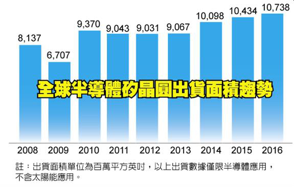 依據(jù)國際半導體產(chǎn)業(yè)協(xié)會(SEMI)旗下硅晶圓制造者部門SMG(Silicon Manufacturers Group)公布的年終硅晶圓產(chǎn)業(yè)分析報告顯示,2016年全球半導體硅晶圓出貨總面積達10,738百萬平方英吋,年成長率達3%,連續(xù)3年創(chuàng)下出貨量歷史記錄新高。