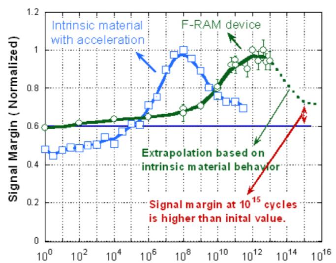 圖1.FRAM器件和本征材料的信號(hào)裕量與周期的關(guān)系圖顯示,與初始值相比,F(xiàn)RAM器件在1015個(gè)周期時(shí)的信號(hào)裕量更高。