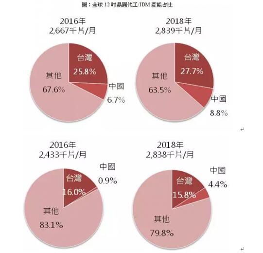 因此2018年中國企業(yè)規(guī)劃的新增產(chǎn)能目標(biāo)將可能難以實現(xiàn),預(yù)期下修到7.2萬片,其中中國廠商的先進(jìn)制程(28nm含以下)產(chǎn)能約1.2萬片,占新增產(chǎn)能近17%,預(yù)計2018年中國自主非存儲器產(chǎn)能將占全球非存儲器產(chǎn)能比重約6.7%。