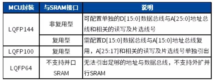 MM32F3270系列MCU因?yàn)榉庋b的原因,導(dǎo)致只有部分MCU產(chǎn)品可以通過硬件復(fù)用出全部或部分的FSMC接口的相關(guān)GPIO,才能支持外接SRAM存儲器擴(kuò)展存儲空間。其中LQFP144引腳封裝MCU芯片支持連接地址數(shù)據(jù)非復(fù)用和復(fù)用方式外擴(kuò)并行SRAM;而LQFP100引腳封裝芯片因地址線縮減,僅支持連接地址數(shù)據(jù)復(fù)用方式外擴(kuò)并行SRAM。LQFP64因?yàn)闊o法引出足夠的地址與數(shù)據(jù)總線,不支持外擴(kuò)并行SRAM。