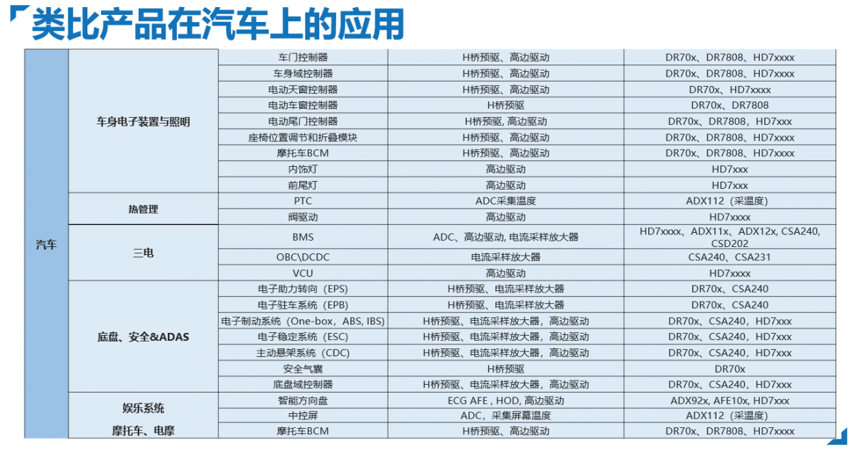 類比半導(dǎo)體高邊驅(qū)動(dòng)產(chǎn)品可用于驅(qū)動(dòng)車身控制域中的各種阻性、感性及容性負(fù)載的驅(qū)動(dòng),其在車內(nèi)外的應(yīng)用非常廣泛,包括車內(nèi)飾燈、頭尾燈、座椅和方向盤及后視鏡加熱、電磁閥、門鎖、電機(jī)等場(chǎng)景。