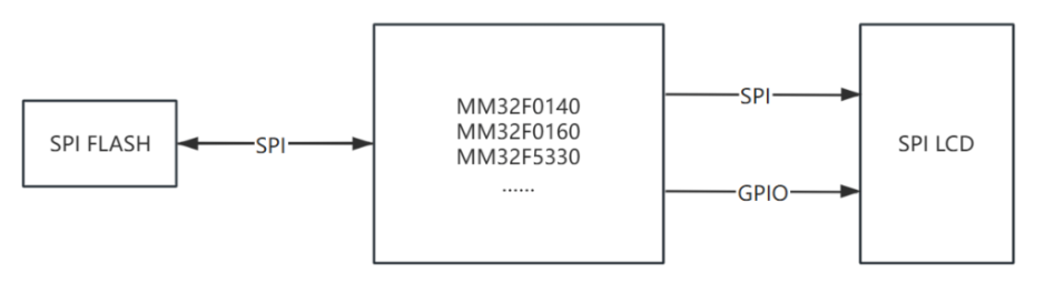 靈動微推出的SPI LCD顯示參考方案,通過SPI接口讀取外部SPI FLASH存儲芯片中存儲的字體、圖片等數據資源,再通過另外一路SPI驅動SPI LCD彩屏顯示。對于不同尺寸、不同分辨率的 SPI LCD 彩屏,客戶可以選擇靈動微電子不同規(guī)格的MCU來實現刷屏效果,硬件設計框圖如下所示: