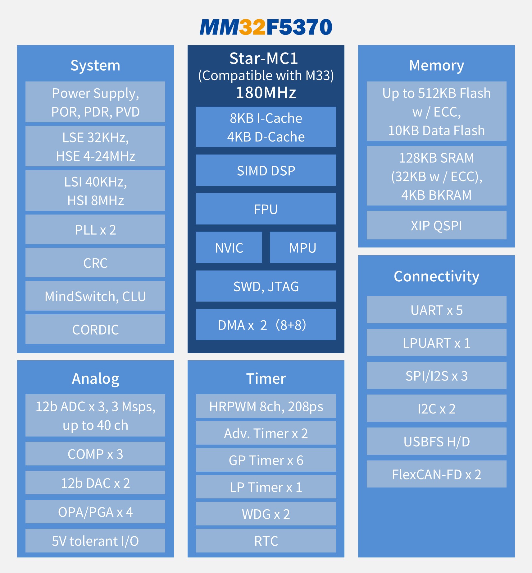 MM32F5370搭載國(guó)產(chǎn)Star-MC1內(nèi)核,基于Armv8-M架構(gòu),指令集兼容Cortex-M33,提供高達(dá)512KB flash,支持ECC,并提供分區(qū)讀保護(hù),支持代碼二次開發(fā),保護(hù)方案商利益;另有10KB Data Flash,獨(dú)立分區(qū)。提供高達(dá)128KB SRAM,其中32KB支持ECC;另有4KB retentionRAM,可在Standby模式下對(duì)數(shù)據(jù)進(jìn)行保持。提供QSPI外部存儲(chǔ)擴(kuò)展接口,并支持XIP。該型號(hào)滿足三電機(jī)應(yīng)用的實(shí)時(shí)控制需求。