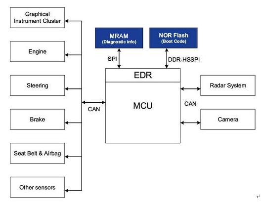 圖 1 為 ADAS 系統(tǒng)如何利用 MRAM 和 NOR 閃存的簡(jiǎn)化框圖。外部 NOR 閃存通常用于存儲(chǔ)啟動(dòng)代碼。然而,ADAS 系統(tǒng)中的各種傳感器通過(guò) CAN(控制器局域網(wǎng))接口定期向 MCU 發(fā)送數(shù)據(jù)。MCU 運(yùn)行自適應(yīng)算法,檢查是否可能碰撞或已經(jīng)發(fā)生碰撞。處理算法的運(yùn)行時(shí)間變量和傳感器的當(dāng)前狀態(tài)則存儲(chǔ)在 MCU 的存儲(chǔ)器中。