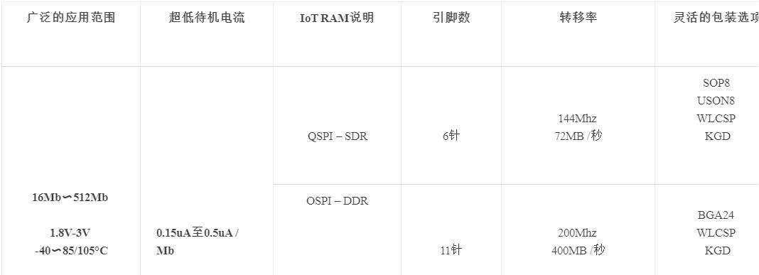 ram替換DRAM,消除了對(duì)外部刷新控制器的需求,這降低了接口的復(fù)雜性和相關(guān)的驗(yàn)證成本,利用了外部SPI接口的使用,同時(shí)保持了最新IoT應(yīng)用程序所要求的高性能水平,并降低整個(gè)系統(tǒng)的功耗。有些基于MCU的舊系統(tǒng)仍在使用SDRAM,在降低功耗和簡(jiǎn)化接口方面,可以受益于IoT RAM的使用。下表清楚顯示了待機(jī)電流和有功電流的優(yōu)點(diǎn),同時(shí)保持了相當(dāng)?shù)膫鬏斔俾省?/div>