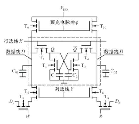 補(bǔ)充充電的過程:加預(yù)充電脈沖∅、預(yù)充電管T9、T10導(dǎo)電,CO1,C02很快充電至VDD,∅撤銷后,CO1,CO2上的電荷保持。然而進(jìn)行讀出操作:地址有效,行、列選線X、Y高電平;R=1,W=0進(jìn)行讀出操作,如果原信息為Q=“1”,說明MOS電容C2有電荷,C1沒有電荷(即T2導(dǎo)電,T1截止);這時(shí)CO1上的電荷將對(duì)C2補(bǔ)充充電,而CO2上的電荷經(jīng)T2導(dǎo)電管放掉,結(jié)果對(duì)C2實(shí)現(xiàn)了補(bǔ)充充電。讀出的數(shù)據(jù)仍為,