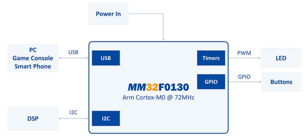 靈動(dòng)微MM32F0133C7P整合USB接口與豐富的資源,在設(shè)計(jì)外接聲卡時(shí)能與DSP做連接與溝通,此外USB界面通過(guò)USB-IF certificate,無(wú)論是在接到Host端的PC/NB,Game console與Smart Phone都可以有良好的兼容性。