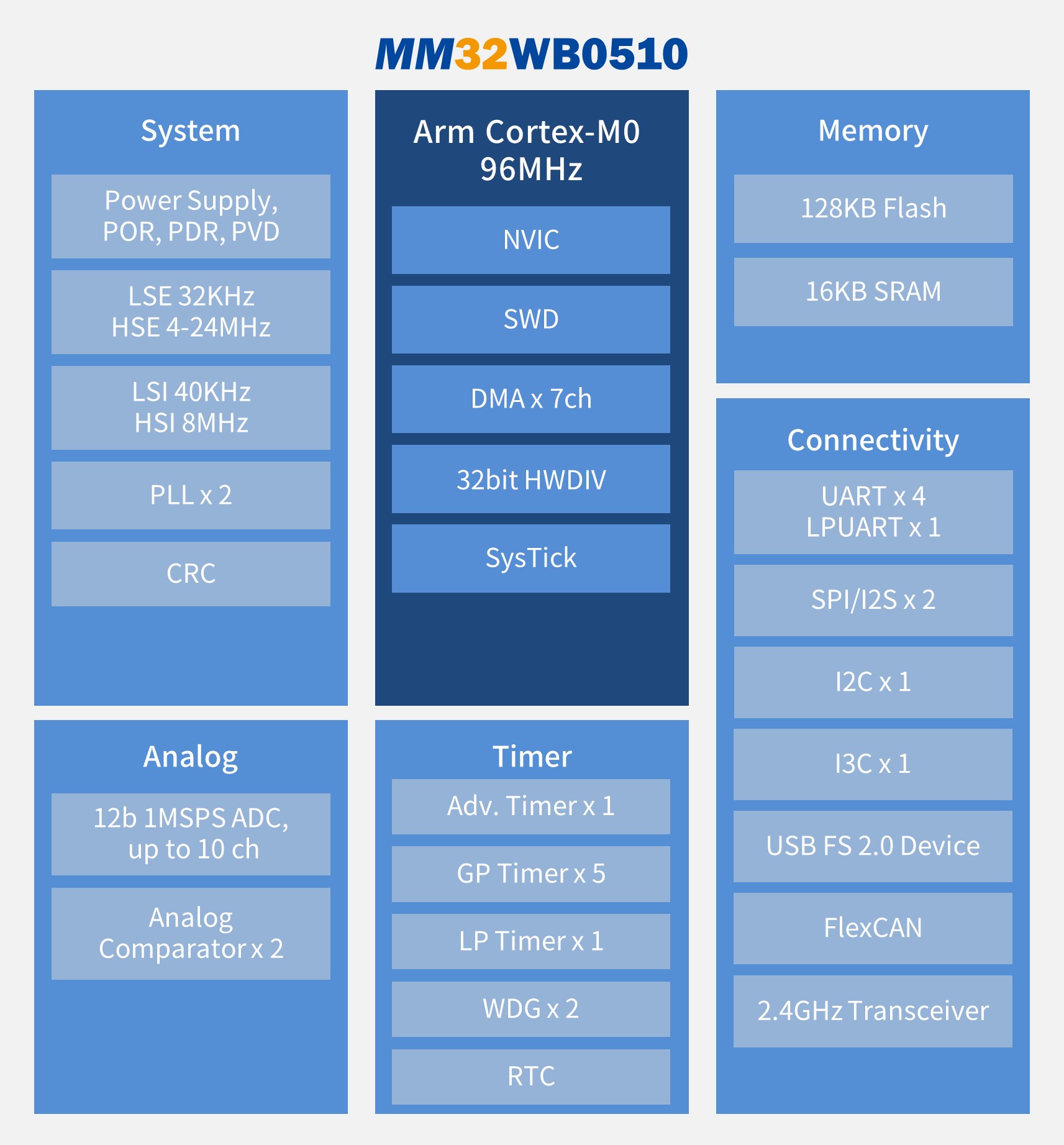 MM32WB0510搭載Arm Cortex-M0內(nèi)核,主頻可達(dá)96MHz,內(nèi)置128KB Flash和16KB SRAM,并集成了USB和FlexCAN接口,面向智能家居,鍵鼠,消防現(xiàn)場(chǎng)部件,電力電子,汽車OBU,汽車傳感器等無線和多接口類型的應(yīng)用??蛇x封裝形式包括:LQFP64,LQFP48,QFN48和QFN32。