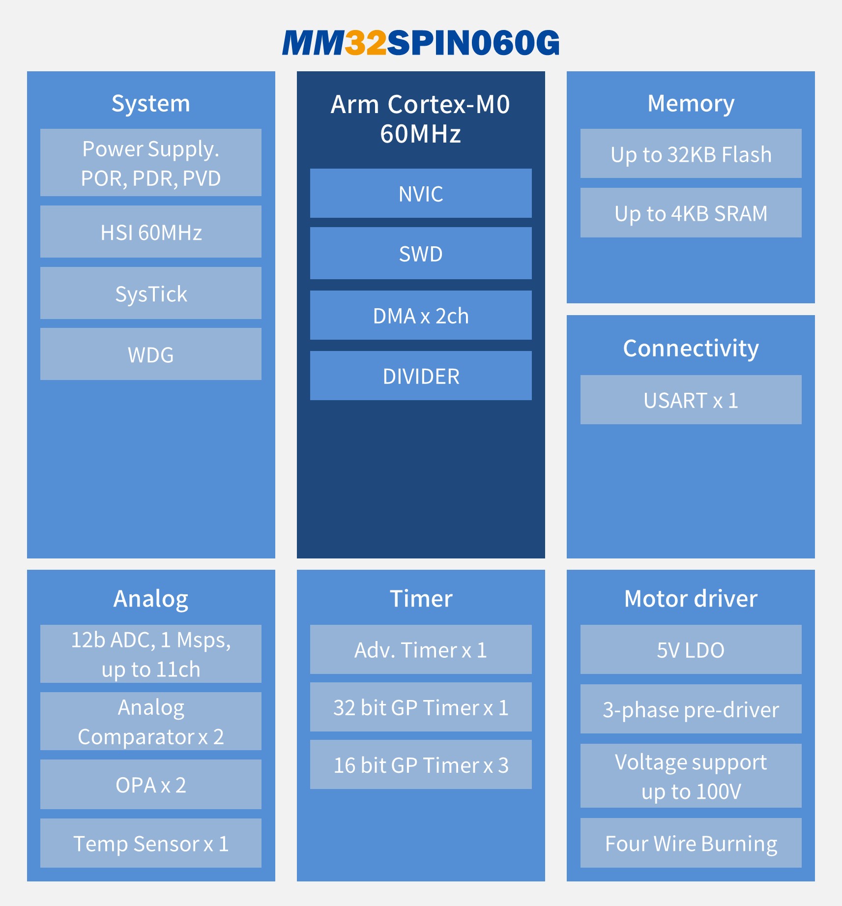 MM32SPIN060G存儲及運算資源:32KB Flash,4KB SRAM,最高主頻60MHz,7個定時器資源:1個16位高級定時器、1個32位通用定時器、3個基本定時器、1個12位IWDG、1個24位Systick,支持2通道DMA,硬件除法器HW-Div,1路12位模數(shù)轉(zhuǎn)換器ADC,支持7通道,采樣速率1Msps,2路模擬比較器COMP、2路軌對軌運算放大器OPAMP,三相N溝道柵極驅(qū)動器,支持UART/SPI通信,內(nèi)部LDO支持工作范圍5.5~18V,預(yù)驅(qū)工作電壓高達100V,支持四線燒錄功能,工作環(huán)境溫度-40℃~105℃,提供QFN32封裝。適用于多種應(yīng)用場合,包括服務(wù)器風機、泵類、風機類、PWM通信控制電機應(yīng)用等。更多詳情請洽官方代理英尚微。