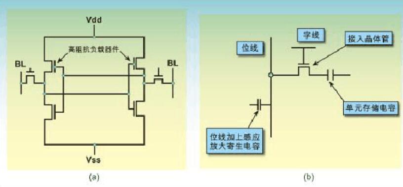 圖1a:典型的六晶體管靜態(tài)RAM存儲單元。圖1b:典型的單晶體管/單電容動態(tài)存儲器存儲單元。