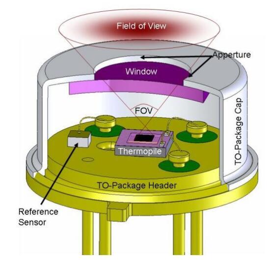 一般采用金屬外殼封裝,物料的紅外射線經(jīng)過表面的濾光片進(jìn)入到里面的熱電堆電偶上,再經(jīng)過信號(hào)感應(yīng)轉(zhuǎn)換成電信號(hào)。