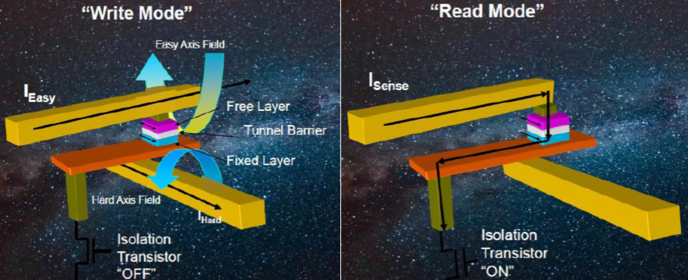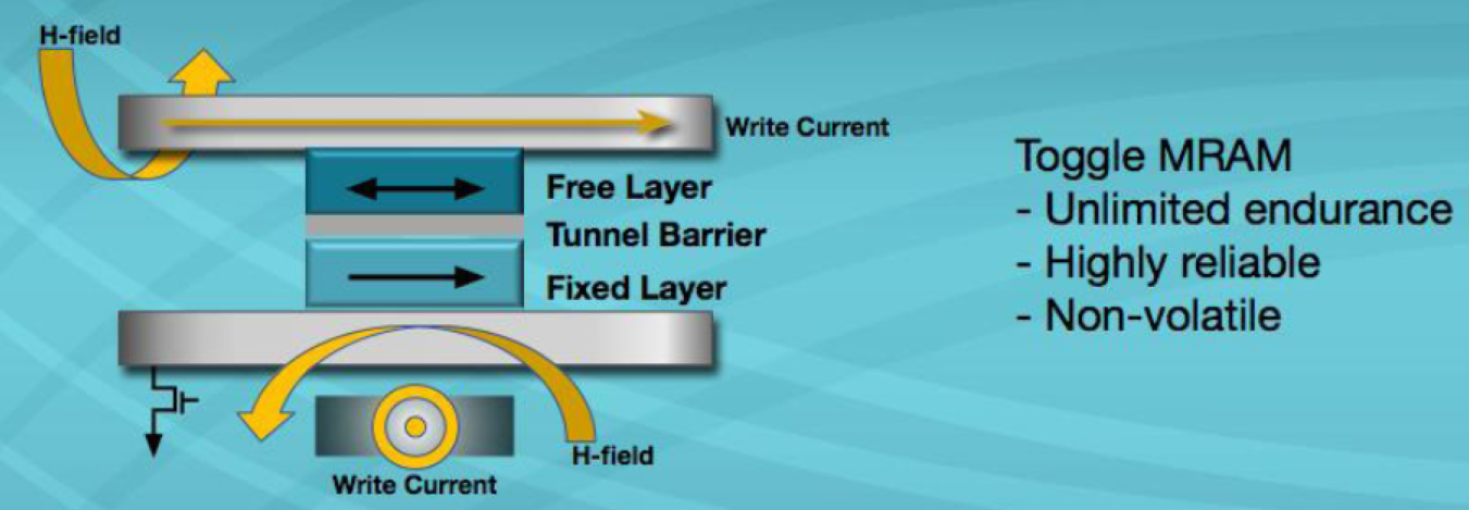 MRAM或磁性隨機(jī)存取存儲(chǔ)器使用具有鐵磁性材料的磁性“狀態(tài)”的1晶體管–1磁性隧道結(jié)(1T-1MTJ)體系結(jié)構(gòu)作為數(shù)據(jù)存儲(chǔ)元素。由于MRAM使用磁性狀態(tài)進(jìn)行存儲(chǔ)(而不是隨時(shí)間推移而“泄漏”的電荷),因此MRAM提供了相當(dāng)長(zhǎng)的數(shù)據(jù)保留時(shí)間(+20年)和無(wú)限的耐用性。切換磁極化(寫入周期)是在電磁隧道結(jié)(MTJ)上方和下方的導(dǎo)線中產(chǎn)生脈沖電流的結(jié)果(見(jiàn)圖1)。電流脈沖產(chǎn)生的相關(guān)H場(chǎng)改變了鐵磁材料自由層的極化,這種磁開關(guān)不需要原子或電子的位移,這意味著沒(méi)有與MRAM相關(guān)的磨損機(jī)制。自由層相對(duì)于固定層的磁矩改變了MTJ的阻抗(見(jiàn)圖2)。阻抗的這種變化表示數(shù)據(jù)的狀態(tài)(“1”或“0”)。通過(guò)測(cè)量MTJ的阻抗來(lái)實(shí)現(xiàn)傳感(讀取周期)(圖3)。MRAM器件中的讀取周期是非破壞性的,并且相對(duì)較快(35ns)。讀取操作是通過(guò)在MTJ兩端施加非常低的電壓來(lái)完成的,從而在部件壽命內(nèi)支持無(wú)限的操作。