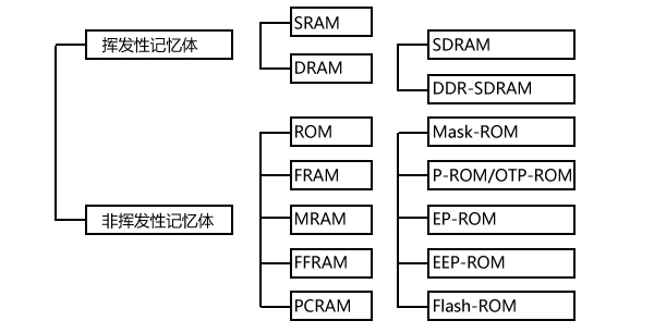 非揮發(fā)性存儲器(Non-Volatile Memory,NVM):電源開啟時資料存在,電源關(guān)閉資料仍然可以保留,例如:ROM、PROM、EPROM、EEPROM、Flash ROM、FRAM、MRAM、RRAM、PCRAM 等。