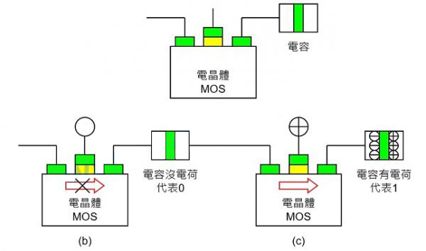 DRAM 使用一個電晶體(MOS)與一個電容來儲存一個位的資料(一個 0 或一個 1),如圖四(a)所示,當(dāng)電晶體(MOS)不導(dǎo)通時沒有電子流過,電容沒有電荷,代表這一個位的資料是 0,如圖四(b)所示;當(dāng)電晶體(MOS)導(dǎo)通時(在閘極施加正電壓),電子會由源極流向汲極,電容有電荷,代表這一個位的資料是 1,為了要將這些流過來的電荷“儲存起來”,因此必須使用一個微小的電容,如圖四(c)所示,DRAM 就是因為電容需要時間充電,所以速度比 SRAM 還慢。